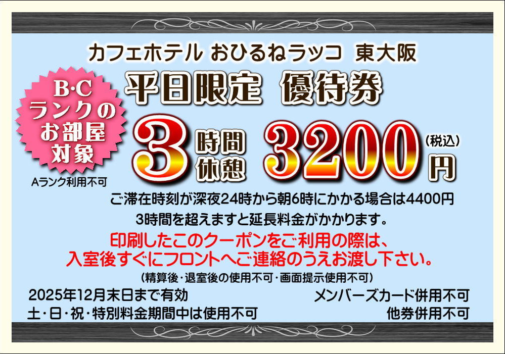 ホテルおひるねラッコ 東大阪 専用 平日限定 3時間休憩優待券