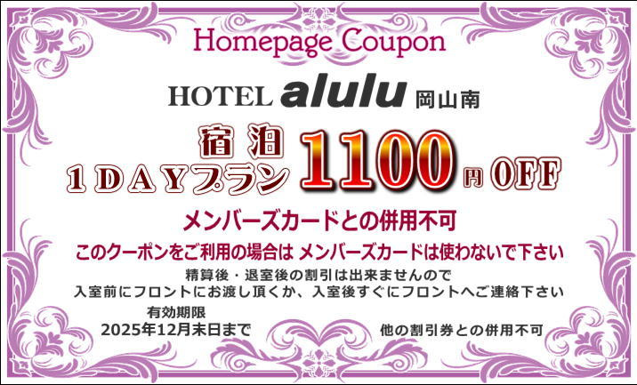 HOTEL alulu 岡山南 専用 宿泊・1DAYプラン クーポン