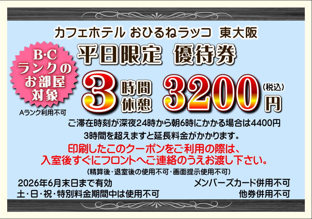 ホテルおひるねラッコ 東大阪 専用 平日限定 3時間休憩優待券