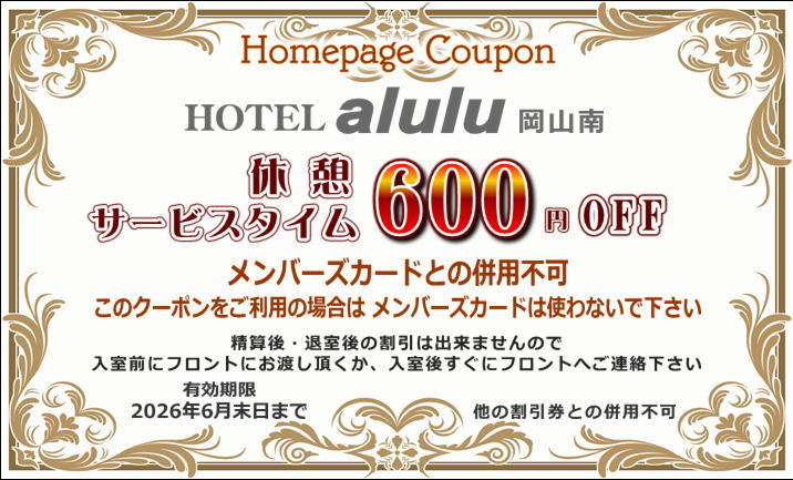 HOTEL alulu 岡山南 専用 休憩・サービスタイム クーポン