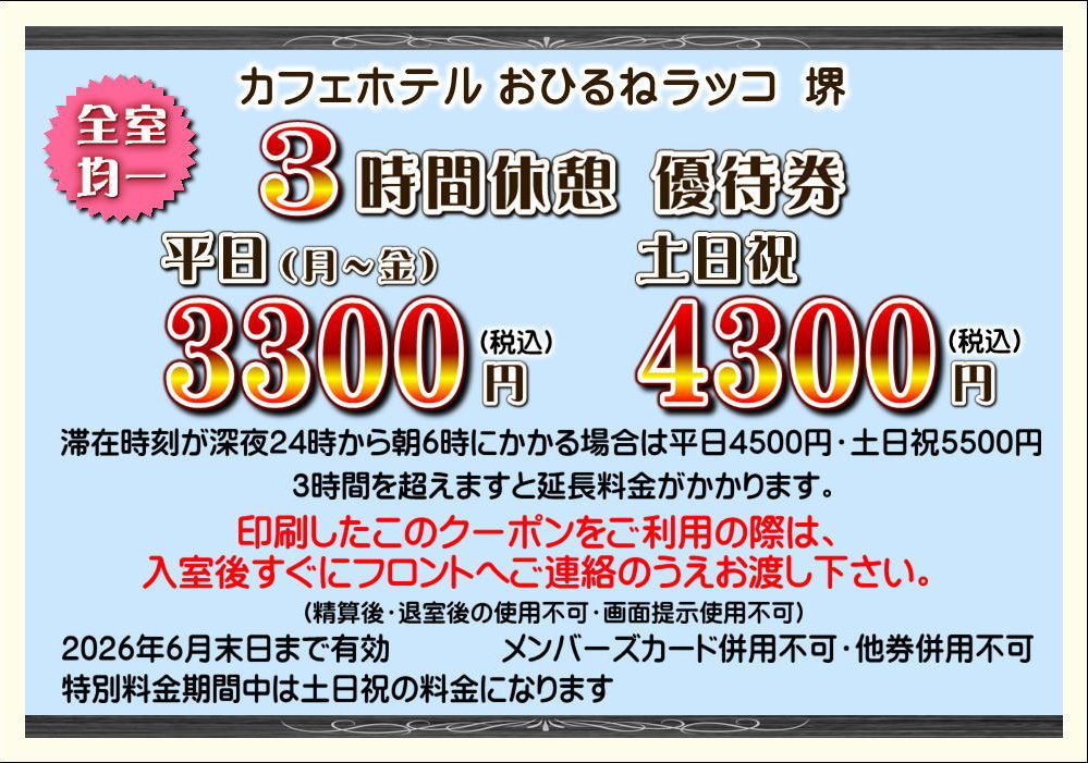 おひるねラッコ 堺 専用 3時間休憩優待券